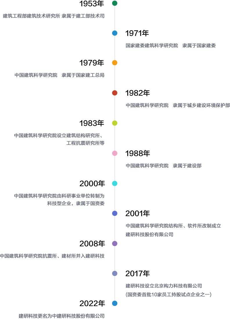 中建研科技股份有限公司(原名“建研科技股份有限公司”,以下簡稱“公司”)成立于2001年,其前身是國家建筑工程部于1953年組建的建筑技術(shù)研究所。現(xiàn)隸屬于國務(wù)院國資委管理的中國建筑科學(xué)研究院有限公司,是由中國建研院結(jié)構(gòu)所、抗震所、軟件所、建材所改制而成的高新技術(shù)企業(yè),是中國建研院旗下核心優(yōu)質(zhì)品牌及資產(chǎn)。公司注冊資本5455.83萬元,其中中國建研院占股份總額的80.29%。2022年5月,“建研科技股份有限公司”名稱變更為“中建研科技股份有限公司”。