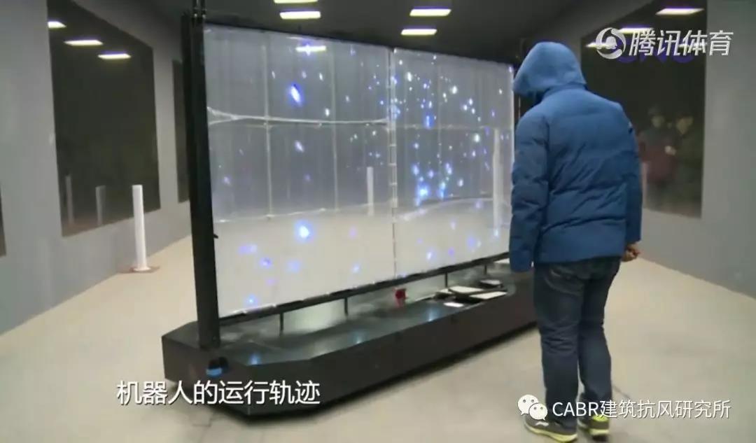 由于會場進出口位置風速較大,冬奧組委委托中國建筑科學研究院建筑抗風研究所進行“冰屏”設備的抗風性能試驗。雙方為“冰屏”制定了近50種工況,測試在不同風速下“冰屏”處于靜止、運動、自轉及傾角等各種狀態時的穩定性。結果顯示,當風速低于8m/s(5級)時“冰屏”工作狀態良好。當風速過高時,科研團隊提出的改進措施也能夠保證“冰屏”的正常工作。