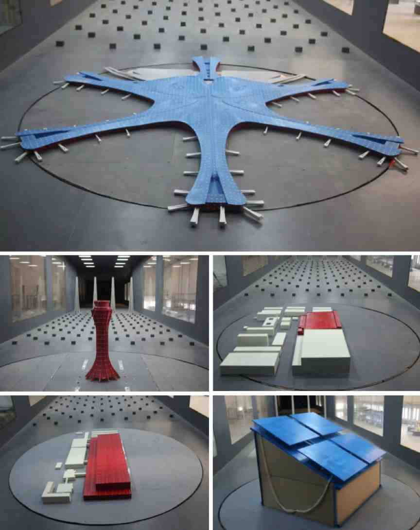 建研科技抗風(fēng)研究中心先后完成了北京大興國際機(jī)場航站樓、東塔臺(tái)、東航機(jī)庫、南航機(jī)庫等項(xiàng)目風(fēng)洞試驗(yàn)和風(fēng)振分析工作,為值機(jī)候機(jī)、空中交通指揮、飛機(jī)維護(hù)等各工種相關(guān)建筑結(jié)構(gòu)的抗風(fēng)設(shè)計(jì)提供荷載取值依據(jù)。