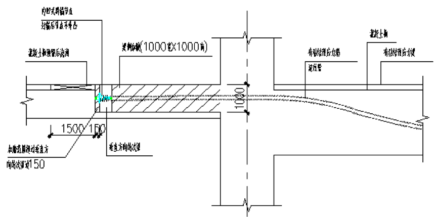 為解決大跨度撓度和混凝土收縮應(yīng)力,本工程采用有粘結(jié)和無粘結(jié)預(yù)應(yīng)力技術(shù)解決超長結(jié)構(gòu)不設(shè)縫的問題。超長結(jié)構(gòu)構(gòu)件主要有:樓層梁、板,有粘結(jié)預(yù)應(yīng)力筋主要布置在大跨度主梁內(nèi),無粘結(jié)預(yù)應(yīng)力主要布置在主、次梁及板內(nèi)。溫度無粘結(jié)預(yù)應(yīng)力主要分布區(qū)域?yàn)椋?span>B1層、F1層、F2層、F3層、F4層、F5層的梁、板內(nèi),無粘結(jié)預(yù)應(yīng)力筋板內(nèi)配筋為2Фs15.2@1000。