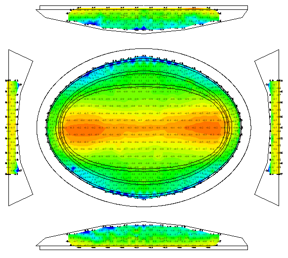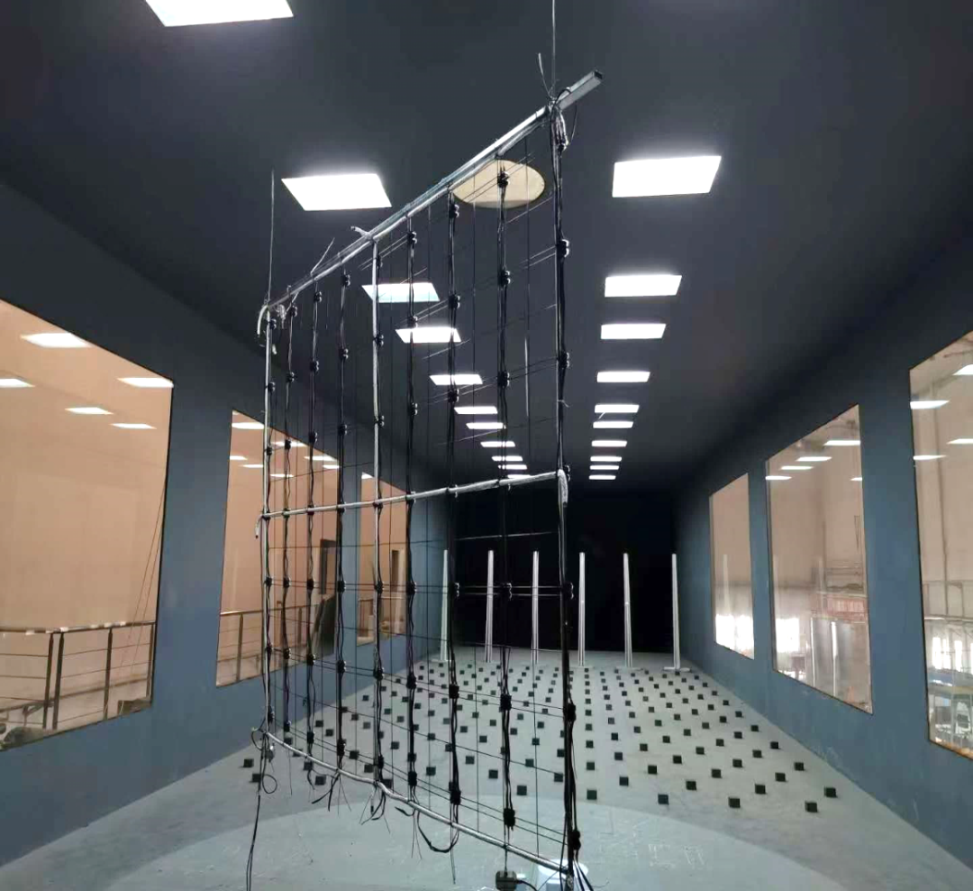 網(wǎng)幕國旗其實是一面巨型索網(wǎng)LED,透風率極高,現(xiàn)有的技術手段很難評估它所受的風荷載。為了保障巨型網(wǎng)幕的安全性,風工程團隊開展了一系列的風洞測試和分析計算工作,最后,通過變風速變風向的詳細分析,評估纜索張力及對吊車起吊能力的需求,為吊車最終的選型提供了重要依據(jù)。