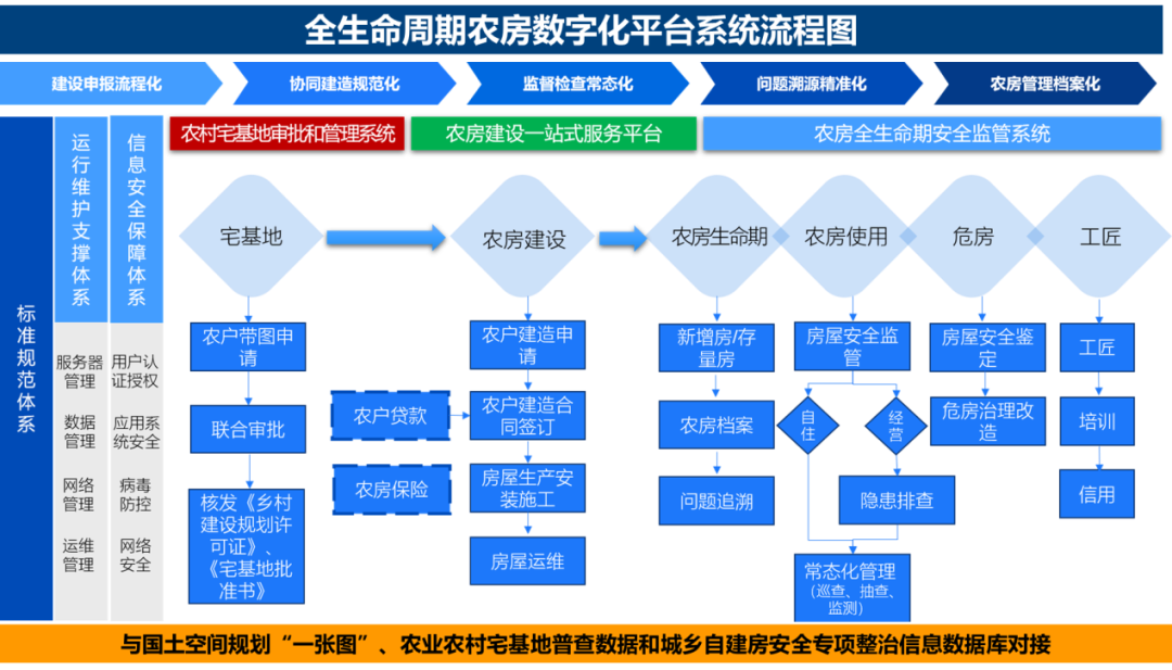 相關部門可以通過農房全生命期安全監管系統,對已通過審批的農村住宅、公共建筑的設計圖紙和施工單位等信息進行建檔,形成全過程電子檔案。通過“四到場管理、巡查管理、抽查管理、農房云監督”等程序,對在建房屋進行全過程監管。