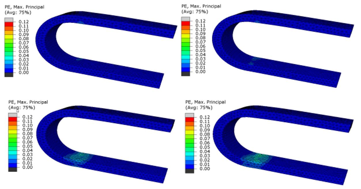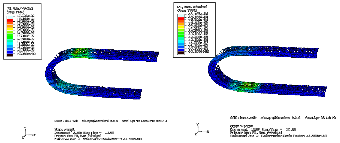 當(dāng)阻尼器上下表面發(fā)生強制水平相對運動時,U型耗能部在上下約束板的約束作用下,以其彎曲部分的曲率中心為轉(zhuǎn)動圓心發(fā)生連續(xù)彎曲變形,因此,該阻尼器中U型耗能部的塑性變形位置將隨變形移動,保證了阻尼器的塑性變形在大范圍內(nèi)均勻分布,提高耗能部的利用效率,實現(xiàn)大變形下阻尼器的耗能性能穩(wěn)定。