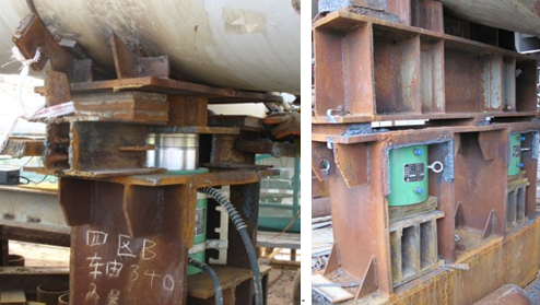 某在建大樓轉換桁架跨度18m,高4m,上部支撐十四層樓面荷載。由于施工時桁架焊接不理想,存在著安全隱患,必須對轉換桁架進行加固處理。因鋼桁架已經承擔較大的豎向荷載,不宜直接進行焊接操作,須先進行卸載。最終采用先增設臨時支撐,將上層框架柱的荷載傳給下部結構然后再焊接。實施時采用8臺千斤500t千斤頂同步頂升,進行卸載,卸載完成后再進行加固。